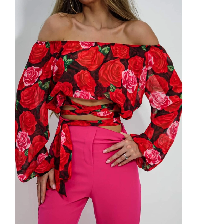 Niezwykła bluzeczka w hiszpańskim stylu. Różany print. Wiązanie w talii, gumka na ramionach, luźne rękawy. Szyfonowy materiał delikatnie prześwituje. Idealna propozycja na romantyczne letnie wieczory.