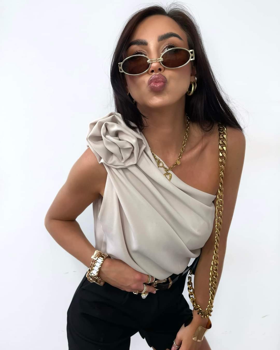 Unikatowa bluzeczka na jedno ramię, krój oversize, marszczenie na ramieniu. Odpinana róża dodaje romantyzmu całej stylizacji.