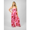 Olśniewający kombinezon na ramiączkach z szerokimi nogawkami, w kolorze różowym, ozdobiony pięknym wzorem czerwonych róż. Wykonany z lekkiego i przewiewnego materiału, zapewnia wyjątkowy komfort i swobodę ruchów. Delikatne poduszki w biuście. Idealny na letnie spacery, romantyczne randki czy wieczorne wyjścia. Ten kombinezon doda Ci wdzięku i kobiecości, podkreślając Twój niepowtarzalny styl.